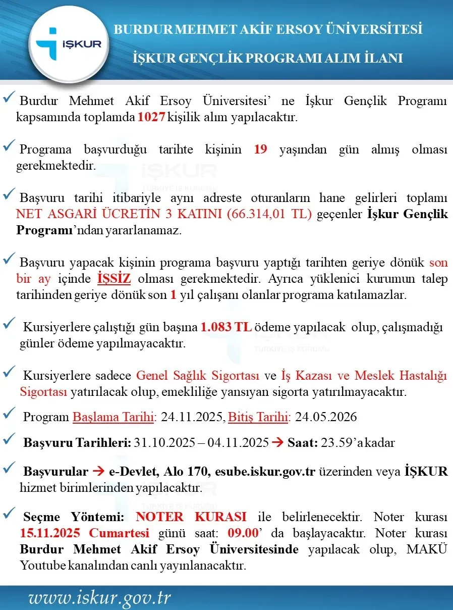 İŞKUR Gençlik Programı kapsamında Burdur Mehmet Akif Ersoy Üniversitesi öğrencileri için toplam 1.027 kontenjan belirlenmiştir.